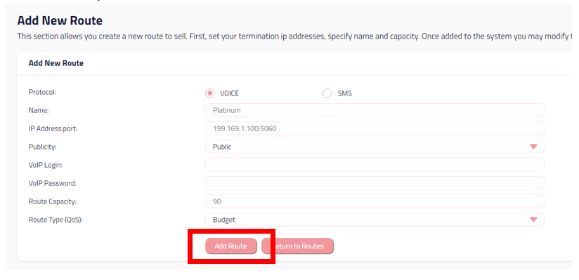 5. Select the protocol for your Route, either it's for Voice Route or SMS Route. Fill the rest information based on your preferences, then Click Add Route