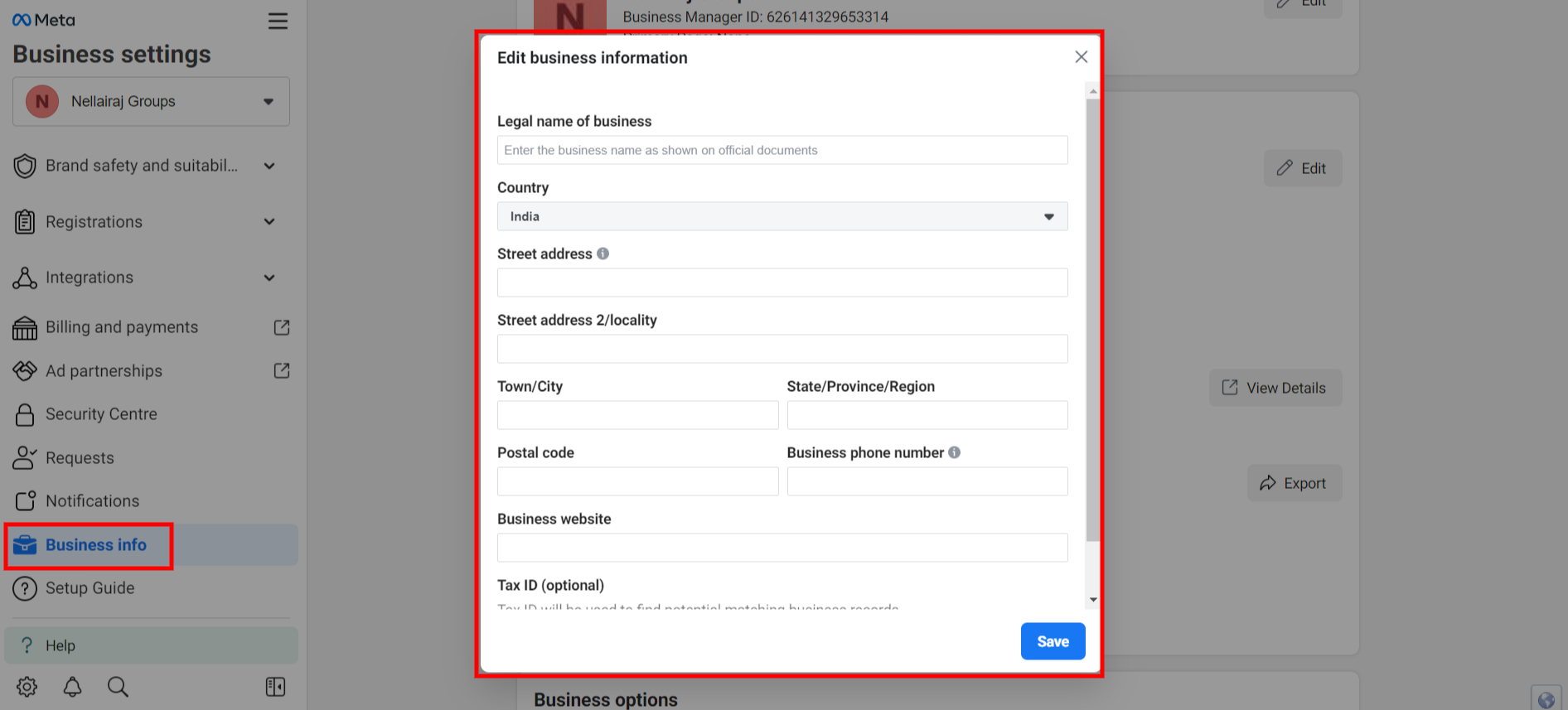 - After confirming, log in and go to Business Settings → Business Info (or Business Details) on the left sidebar.